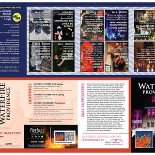 One of my biggest and longest running projects while working for WaterFire was the pamphlet and map used for the art installation event we would host in downtown Providence. For every one of the events of the season there would be a pamphlet designed and printed with details specific to each event. I was tasked with redesigning the pamphlet map and wanted to create one that accurately reflected WaterFire's brand and the feel of the event. All of the elements were digitally drawn by me, and I stylized everything with WaterFire's brand colors and iconic imagery to give it a lot of personality. Since it is a nighttime event, I wanted to represent that in the map by using the dark blue background. This map design is still currently used in their printed event pamphlets and is updated for each unique event. For the rest of the pamphlet, relevant images would need to be collected from the photo library and details would need to be changed out every time.